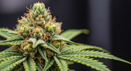 Close-up of a large, beautiful purple bud of legal medical marijuana with white pistil hairs, cultivated in a controlled environment and isolated from its background.