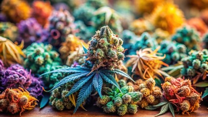 Colorful dried cannabis buds with individual leaves and tiny pistils
