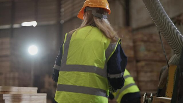 woman worker carpenter wearing safety uniform and hard hat working and checking the quality of wooden products at workshop manufacturing. man and woman workers wood in dark warehouse industry.