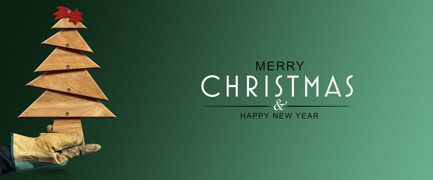 Hand with protective work gloves holding a small wooden Christmas tree with a red comet star, on green background with text Merry Christmas & Happy New Year.