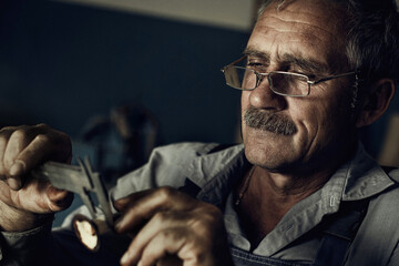 An old man with glasses at work in the workshop measures a detail. Artistic photo of an elderly master. Cinematic processing of photography.