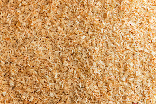 Sawdust from a chain saw lies on the ground, background texture