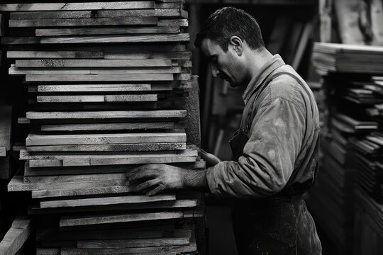 Carpenter inspecting wood planks in workshop, lumber stacks background, industrial setting, stock photo