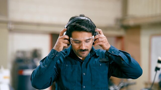 Male carpenter with a mustache putting on noise canceling headphones for hearing protection. Man getting ready for work in a workshop