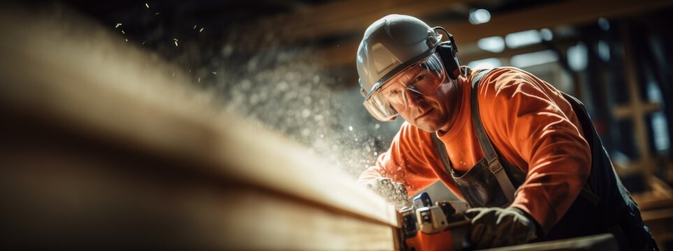 Craftsman focuses intently while operating a circular saw, cutting through wooden planks in a well-lit workshop