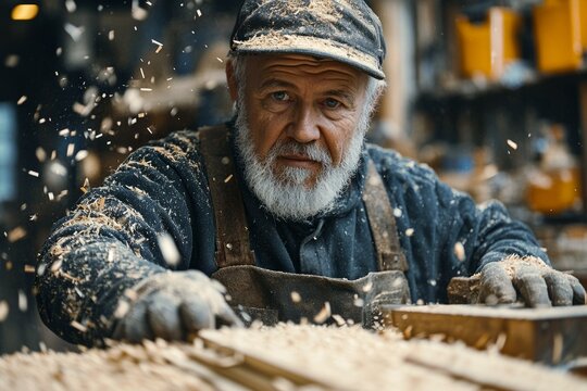 Skilled carpenter focused on woodworking craft in dusty workshop environment, showcasing dedication and expertise