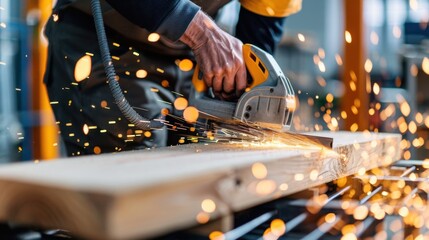 Skilled craftsman using a jigsaw to cut wood with flying sparks in a workshop environment showcasing craftsmanship and precision