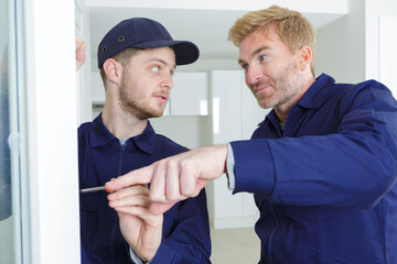 Midsection of carpenter carrying plank while coworkers working in kitchen at home