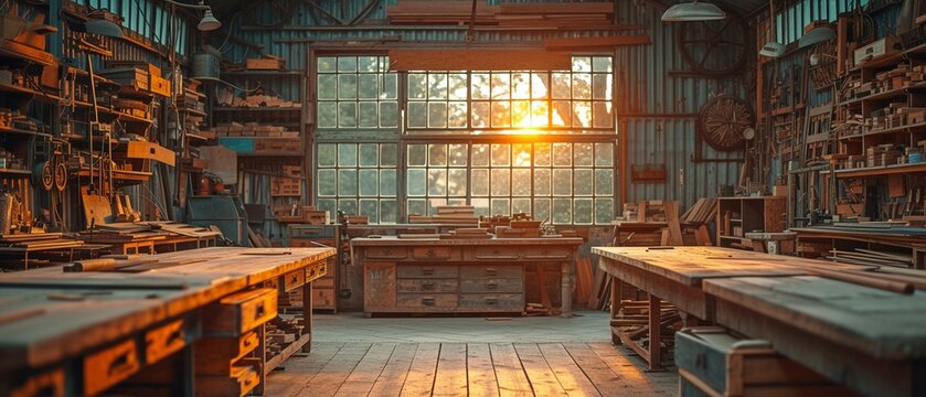 Carpenter works with wood in carpentry workshop. Man doing woodwork professionally