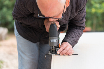 Artisan's Touch: A close-up shot of an artisan's hands creating and working on a wooden surface, a cloud of sawdust dancing in the air. Capturing the craftsman's skills, experience.