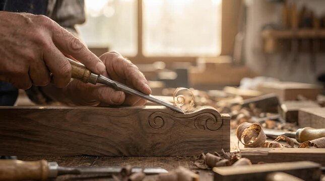Close Up of Carpenter Using Chisel Carving Intricate Design On Wood Block In Workshop With Natural Light Through Window