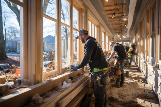 Construction Worker Measuring and Leveling Wood Beams in a Building Site