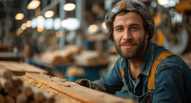 Smiling carpenter working with wood in workshop. A young carpenter with a beard shows pride in his work while shaping wood at a busy workshop during the day.