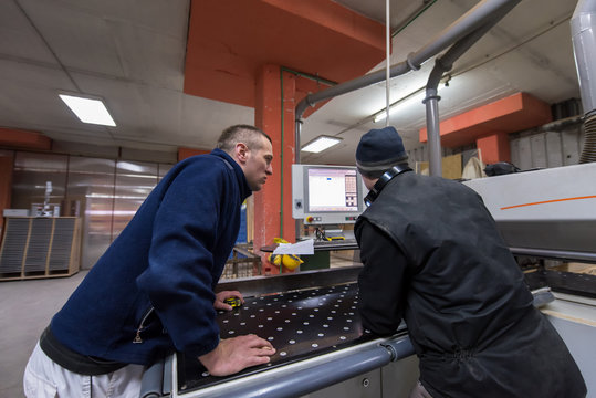 Worker sets the program with the control panel on an automatic woodworking machine with a CNC