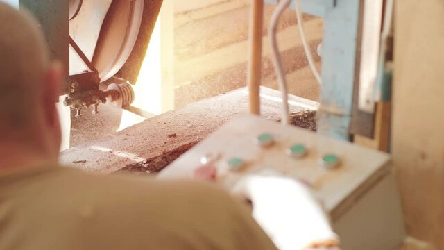 Carpenter worker using CNC Wood cutting machine in woodworking company.