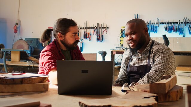Cabinetmakers doing brainstorming while using CAD software on laptop, discussing wood designs. Carpenters in assembly shop discussing, using program on notebook to plan furniture assembling, camera B