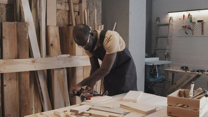 Medium long shot of African American specialist in protective glasses and black apron changing texture of wooden plank when crafting in carpentry studio