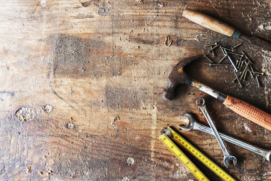 Vintage woodworking tools arranged on a rustic wooden surface, showcasing craftsmanship and history.