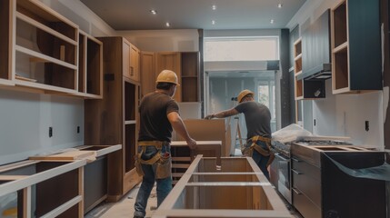 Construction workers install new windows at home using safety equipment