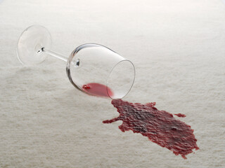 Glass of red wine spilled on white carpet