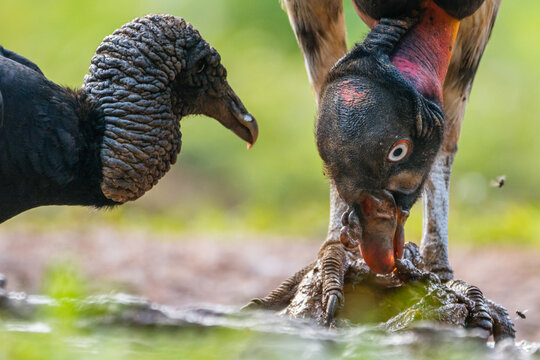 Juvenile King Vulture (Sarcoramphus papa) feeds on a carrion while a black vulture (Coragyps atratus) watches, Laguna del Lagarto, Costa Rica