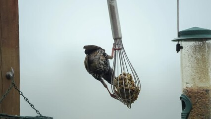 Starling (Sturnus vulgaris) on a fat ball feeder