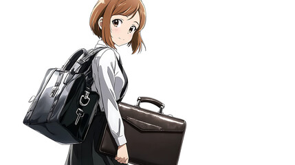 A woman is carrying a black briefcase and a backpack. Generated using AI.