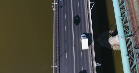 top of large big bridge road with cars vehicles traffic coming and going passing zooming uphill downhill ascending descending with sidewalk and railing and clouds sky behind