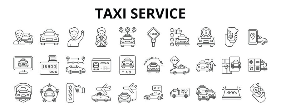 30 Taxi Service Line Icons Vector - Ride Hailing, Taxi Stand, Drop Off, Fare Estimator, Carsharing, Airport Taxi, Booking