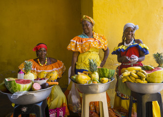 Women in traditional costume selling fruit in Cartagena, Colombia