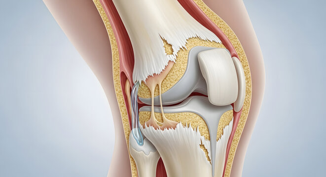 Medical illustration of a human knee joint with advanced osteoarthritis, showing cartilage erosion and bone spurs