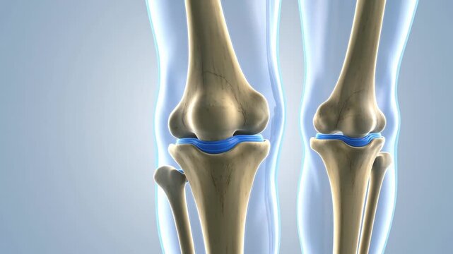 3D medical animation of human knee joint anatomy with highlighted cartilage and bone structure in transparent x-ray view