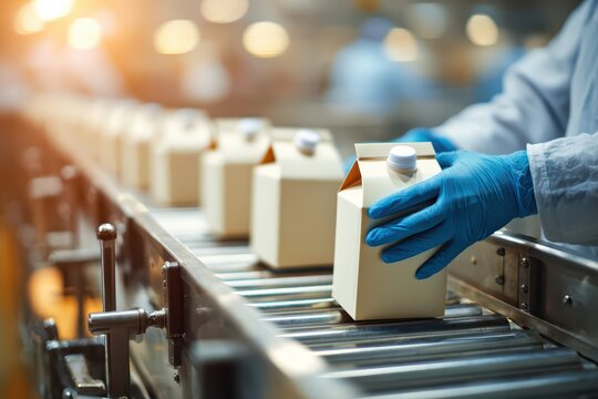 Close-up of worker placing milk cartons on a conveyor belt in a factory for quality control, ensuring perfect product packaging and efficient production line operation.
