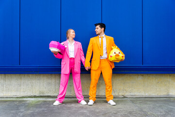 Man and woman wearing vibrant suits standing together in front of blue wall with animal masks in hands