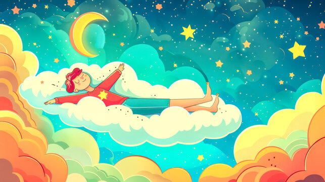 Young boy sleeping peacefully in sky surrounded by stars and crescent moon