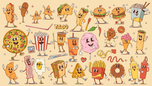 Fast food and breakfast cartoon retro groovy characters. Vintage hippie burger, pizza, sandwich and drinks with dessert vector personages. Cute hot dog, french fries, soda, coffee, donut and ice cream