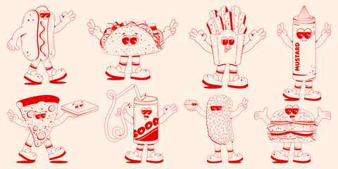 Set of fast food characters in retro linear style. Hamburger, pizza, soda, hod dog, fries. Doodle illustration in retro cartoon style.