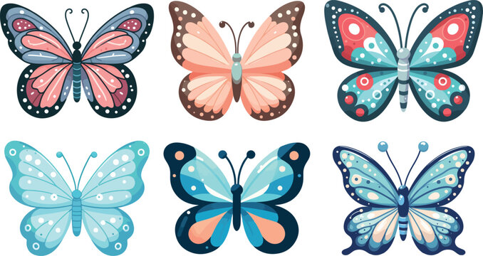 Groovy butterflies vector set. Hippie floral elements. 70s groovy hippie nature clipart. Retro groovy stickers. Psychedelic funky 60s 70s doodles. Set of retro cartoon flower stickers.
