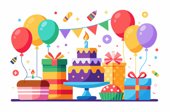 Birthday or anniversary cake with balloons on dark room for celebration background.