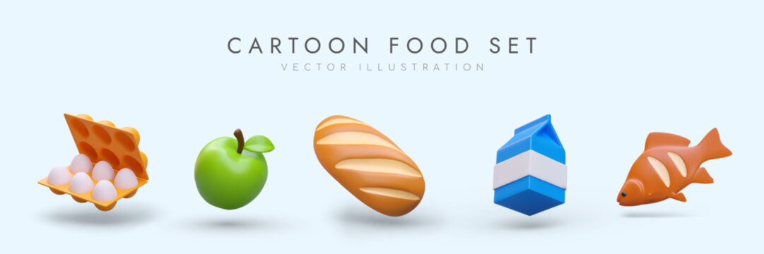 Set of icons in cartoon style. Eggs, apple, bread, milk, fish. Labels for product categories in store, menu, recipe. Isolated colored vector illustration