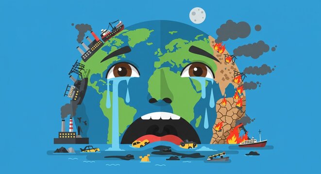 A cartoon Earth with a sad face cries as it is consumed by pollution, fire, and environmental destruction. Factories, oil spills, wildfires, and droughts illustrate the global ecological crisis.