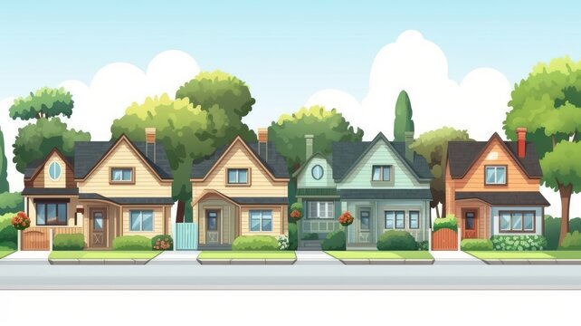 Colorful town houses trees, cartoon urban landscape, flat design. Quaint neighborhood scene, stylized residential district, variety homes architecture. Isolated white background