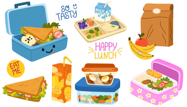 School lunch box, container, tray with meals, paper bag. Various food: sandwich, fruits, milk, juice, soda. Hand drawn Vector illustration. Isolated elements, design templates. Healthy food concept