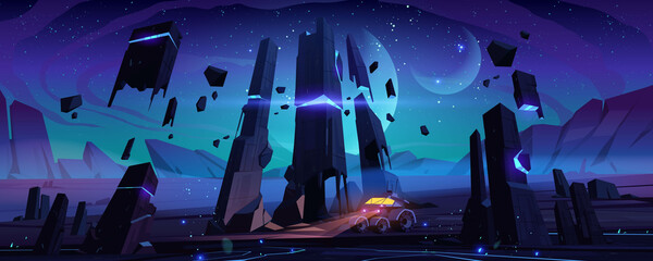 Explorer robot on alien planet surface at night. Vector cartoon futuristic landscape of planet with rocks and cosmos with moons and stars. Space illustration with exploration machine