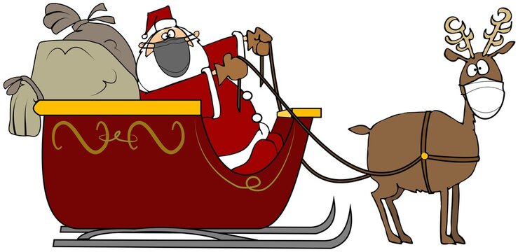 Santa's sleigh pulled by one reindeer wearing a face mask