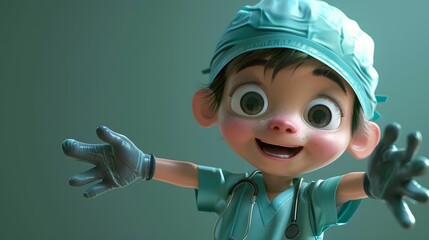 A cute 3D cartoon of a young child dressed as a surgeon, complete with oversized surgical gloves and a playful expression