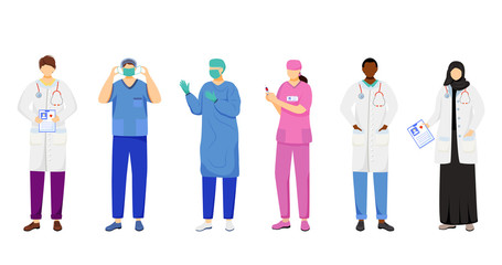 Doctors flat vector illustrations set. Multicultural therapists, general practitioners. Surgeon, nurse cartoon characters. Female arabic medic, african american physician isolated on white background