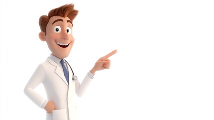 A friendly cartoon doctor with a stethoscope pointing to the right, smiling broadly.