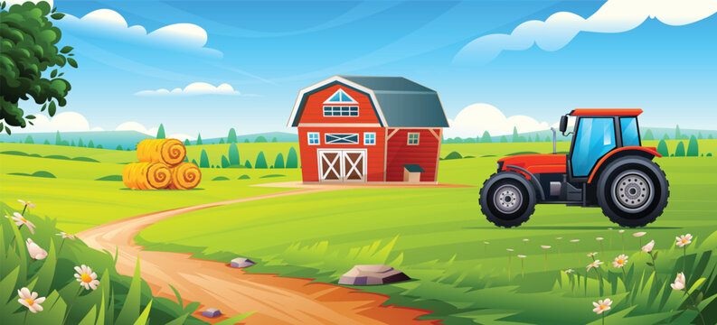Rural farm field landscape. Red tractor near hay bales and barn on a bright summer day with green fields. Vector cartoon illustration