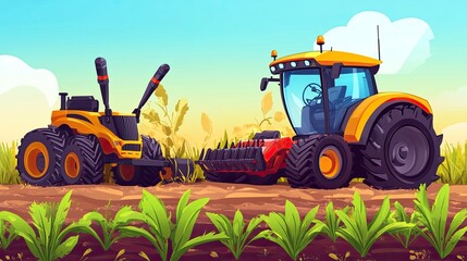 Bright and lively cartoon of agricultural robots and futuristic tractors, showcasing transformation in farming, with a designated text area.